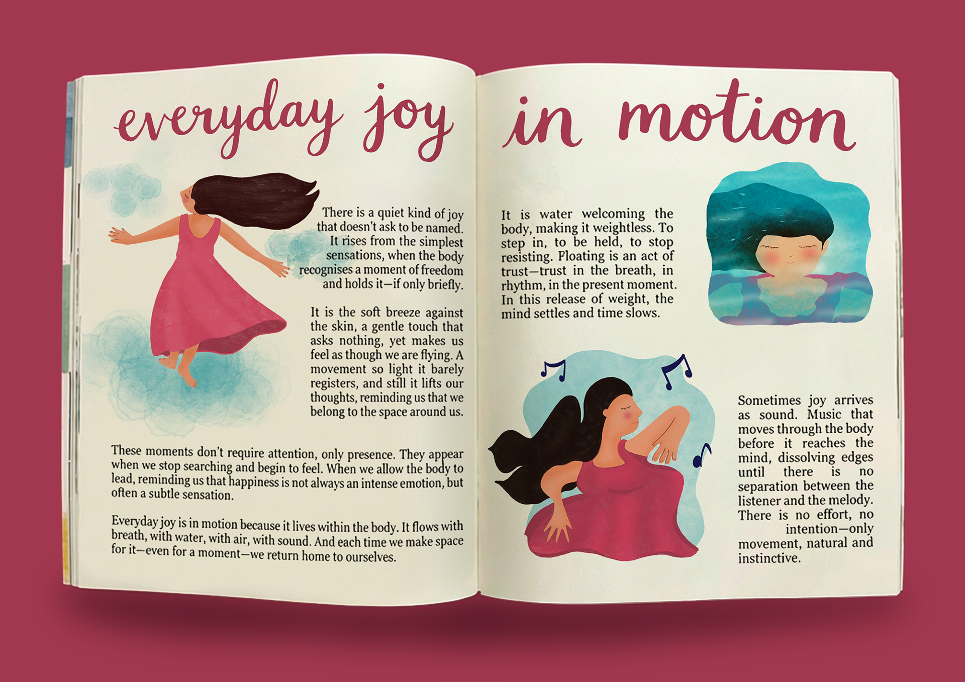 This personal project was created for a brief by Libby VanderPloeg, inviting us to illustrate the small joys of everyday life in motion. I chose to focus on inner joy—the intimate, deeply personal feeling that arises in the simplest gestures: a gentle breeze on the skin, floating effortlessly in water, becoming one with music. Through this series of spot illustrations, I explored how these subtle experiences can be true moments of lightness and presence, reflecting my tendency to experience life in a deeply introspective and sensory way.
